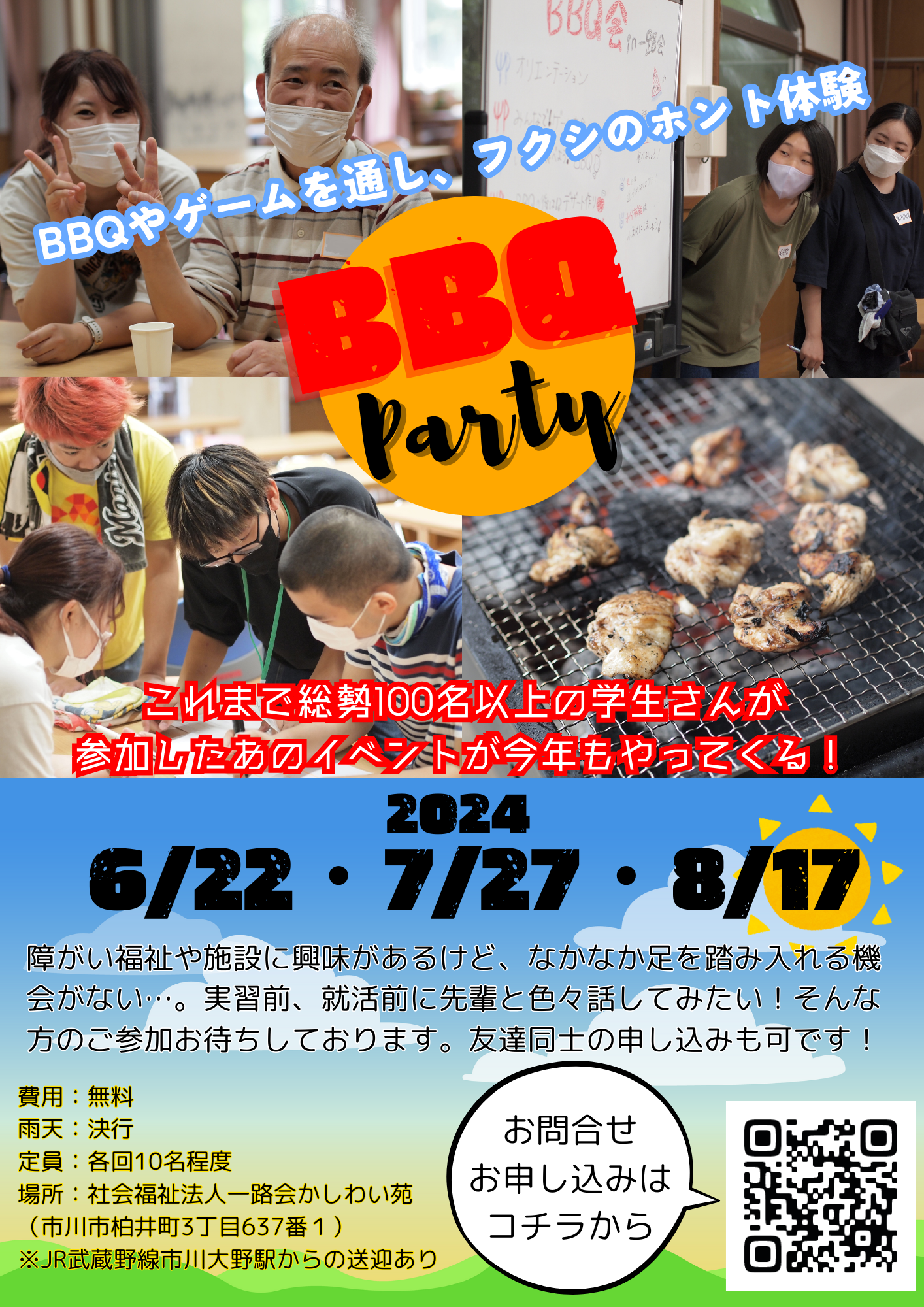 障がい福祉に興味がある、これから実習に行くけど施設に入ったことがないから不安、就職を考えていて実際に働いている人と話をしてみたい…という方。 この夏、BBQを利用者さんと一緒に楽しみながら福祉に触れてみませんか。過去、多くの学生さんが参加し、好評をいただいている企画が今年も開催です。 ご希望の方は、下記フォームよりお申込みください。追って、こちらよりご連絡させていただきます。