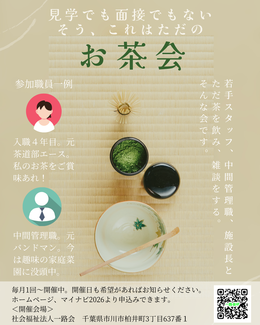 見学でも面接でもない。雑談する為の企画「お茶会」が定期開催となりました。 1日1組限定(3名まで)の完全予約制でお茶とお菓子で雑談をしましょう!福祉の気になる事、お給料の事、職員のプライベートまで何でも聞き、聞かれ、 楽しい時間を過ごしませんか?お気軽に下記申し込みフォームよりお問い合わせください。当日は施設内の見学などはしません。またスーツは禁止。平服でお越しください。 こちらの企画は学生さんだけでなく転職をお考えの方も参加可能です。
